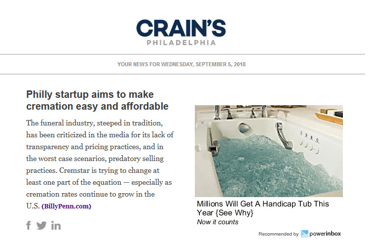 Here we go: A story about death, or more precisely, cremation made easy. Startup Cremstar is kind of like the Uber of Ashes, if you get my drift.