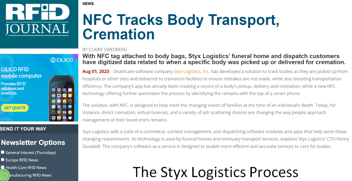 PHILADELPHIA, PENNSYLVANIA, UNITED STATES, June 14, 2023/EINPresswire.com/ – – Philadelphia-based deathcare software developer Styx Logistics has successfully completed a beta test program using an RFID chip to track bodies from their initial removal to their final disposition in area crematories. Styx Logistics offers funeral homes a suite of eCommerce, Content Management (CMS) and Dispatching Logistics software modules and apps, available to funeral homes and mortuary transport services on a subscription (SaaS) basis. With the addition of this patent–pending “digital toe tag,” Styx is now the only deathcare software provider offering complete end–to–end digital tracking through the company's Funeral Director, Driver and Crematory apps.