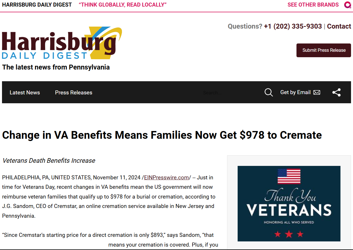 PHILADELPHIA, PA — Just in time for Veterans Day, recent changes in VA benefits mean the US government will now reimburse veteran families that qualify up to $978 for a burial or cremation, according to J.G. Sandom, CEO of Cremstar, an online cremation service available in New Jersey and Pennsylvania.